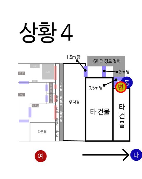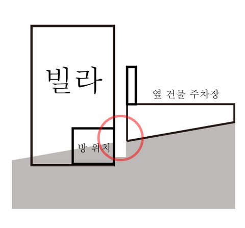 이렇게 살짝 경사진 위치에 반지하에 저희 집이 있습니다저희 집 창문 쪽 밖에는 좁은 공간이 있고, 그 좁은 공간 옆으로 주차장과 그 사에 담이 있습니다. 그 사이를 들어갈 수 있는 방향으로는 문이 항상 잠겨있구요