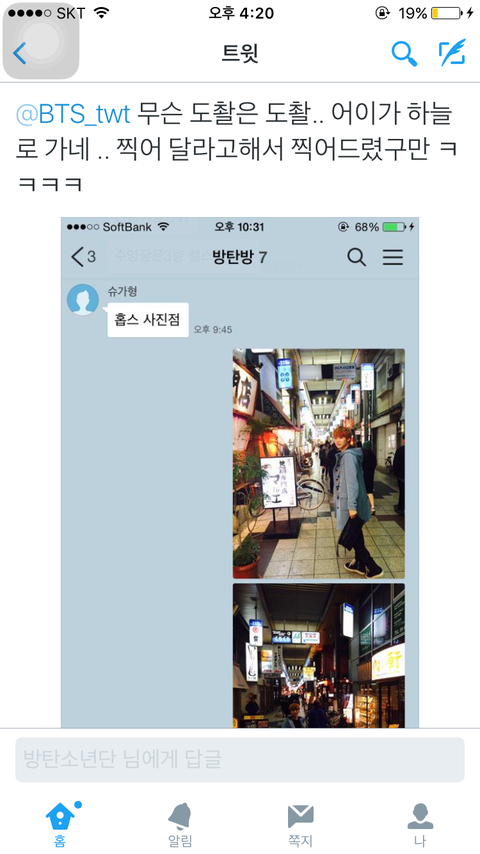 혼자 큭큭되게 돼ㅋㅋㅋㅋㅋㅋ 홉이가 도촬했다고 올린 민군주와 어이가 하늘로 간다는 홉잌ㅋㅋㅋㅋㅋㅋ