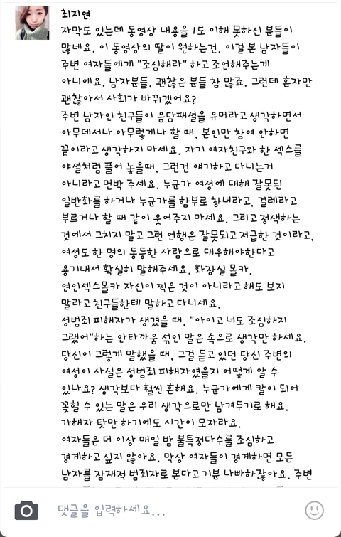 페이스북잘안하는데 우연히이거보고 캡쳐해서올립니다. 진짜 페이스북하시는분들 제가링크거는법을몰라서그러는데 이거 꼭보시고 최지연님한테 댓글달아주세요. 저 논리정연한글에 병ㅡ신들이몰려서 **중임. 메갈까지끌여들여서 들먹이고있음. 진짜 여성?에대한게 요즘들어부쩍 이슈가된듯. 기쁘다. 이런이슈라도 우리가 힘을보여줄수있었으면좋겠어요ㅇㅇ 다들힘을보여주러갑시다. 최지연님진짜 존경스럽다..