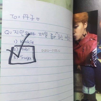 이거 아마 질문 의도가 지민이를 제일 좋아하는 멤버를 물어본 거 같은데...홉이랑 윤기를 표시함(짐니가 표시한 거 맞겠지...?)보면 융기랑 홉이한테 짐니가 장난 많이 침...자기를 갱장히 아낀다는 걸 본인도 아는 거 같음ㅋㅋㅋㅋㅋㅋ태태앱 번지점프 편에서 마지막에 번지점프 확인증인지 뭔지 주는 것도 보면 짐니가 융기 꺼만 안줌ㅋㅋㅋㅋㅋㅋ자기가 막 장난쳐도 화 안 낼걸 아니까 그러는 거 같음...일종의 자신감...?