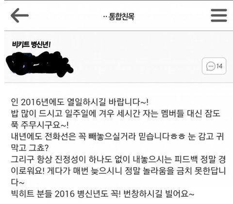 이글 금방 없어질꺼야. 운영진방으로 옮겨져서 못보게 될껄. 내가 당해봐서 알아. 정국이 사건때 빅히트에 사과문 제대로 올리라고 썼는데 5분? 만에 없어지고. 운영진한테 쪽지 와있음. 멤버들도 보는 곳이라 보기 불편한 글은 관리한다나 어쩐다니. ㅅㅂ 그래서 내가 쓴글 조회는 되길래 운영방에 옮겨져 있는거 내가 지웠어. 공카는 그렇게 보이지 않는 벽이 높다.