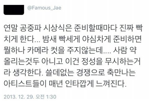 사과는 했지만 이미 늦었음 진짜 너무 속상함 우리는 편집 같은 것도 안 하고.. 대우가 성기같음 이럴거면 내년부턴 아예 안 나갔음 좋겠다 기대했는데.. 월드투어 끝나고 진짜 정식으로 하는 생방 이었는데..
