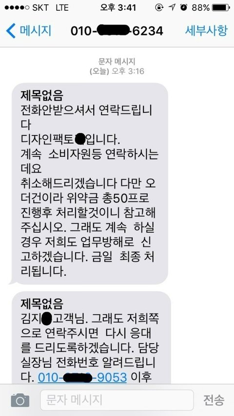 저는 이글을 12월 15일 국민신문고, 공정거래위원회에 민원 접수를 했으며 그 다음 업체로부터 전화 한통(2015.12.17.)과 문자두통이 왔습니다.
