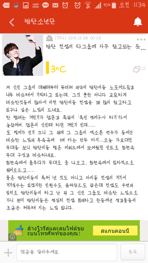 하도 팬덤앱거리길래 오늘가서 봤는데 불판? 이란곳에 몬별엑스가 방탄을 따라한다고 써있네요. 자기들 말로는 컨셉이나 옷스타일 따라한다고 하는데 팬톡에는 이런논란 없었지 않나요..?; 오히려 문제 조장은 이분들이 하는거 같네요. 저는 몬별엑스분들이 방탄을 따라한다는 느낌은 안들었는데 어떻게 생각하시나요?