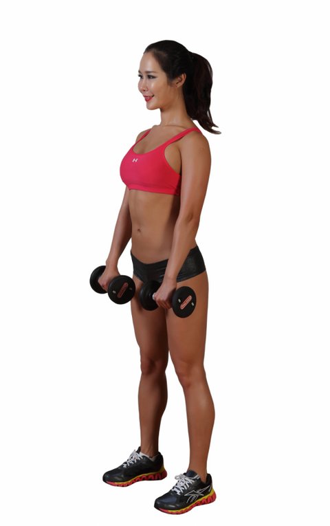 양손에 덤벨을 하나씩 잡고 똑바로 선다. 양발을 어깨 넓이로 벌리고, 팔꿈치는 10~30도 각도로 굽힌다. 숨을 내쉬면서 왼손의 덤벨을 눈높이까지 들어 올린다. 숨을 들이쉬면서 왼손을 원위치로 되돌린다. 이 동작을 오른손으로도 반복한다. 세트를 마칠 때까지 손을 번갈아 가면서 같은 동작을 한다.