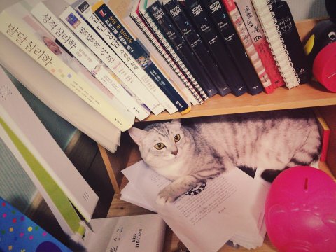 꾸미는 책꽂이밑에 들어가서 앉아있는 것과 에이포 용지 찢는걸 좋아해요. 하.. 과제 제출하려고