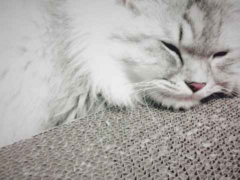 처음엔 스크래쳐를 쳐다보지도 않더니 이젠 벅벅 잘 뜯어요. 심지어 베고 자기까지해요!