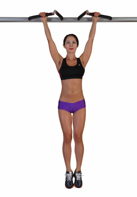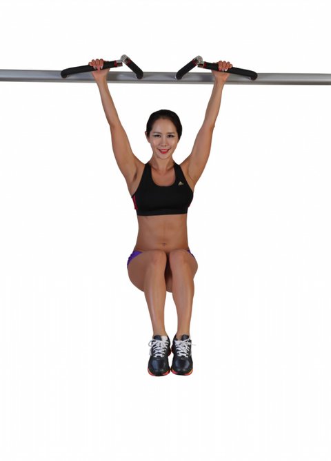 양발을 어깨너비로 벌리고 손바닥이 정면을 향하도록 하여 친 업 바를 잡는다. 바에 매달린 뒤, 발이 바닥에 닿지 않도록 무릎을 15도 정도 굽힌다. 숨을 내쉬면서 무릎을 가슴 쪽으로 끌어 올린다. 이 상태에서 약 2초 동안 정지해 복근 수축을 최대화한다. 다시 숨을 들이쉬면서 무릎을 내린다.