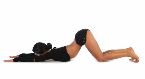 1-바닥에 네발기기 자세로 엎드려 두 손을 앞으로 밀어 가슴 부위와 필꿈치가 바닥에 닿도록 뻗어준다. 숨을 내쉬며 어깨를 펴고 등이 활처럼 휜 상태로 양팔을 바닥 쪽으로 누른다.