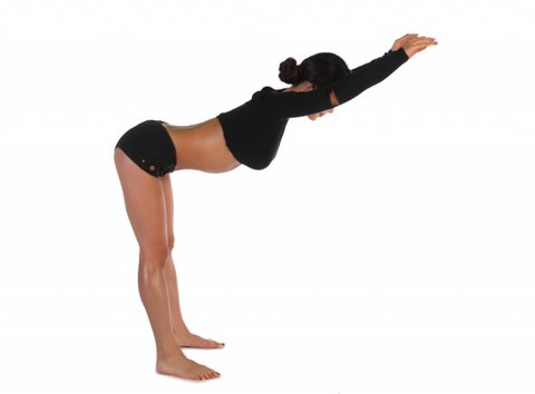 2-엉덩이나 어깨높이 정도의 벽에 설치된 지지대에서 약 1cm 정도 떨어져 어깨넓이로 발을 벌려 선 후 양팔을 머리 위로 올린다. 팔과 무릎은 곧게 펴고 등은 평평하게 한 상태로 윗몸을 숙여 양손으로 지지대를 잡는다. 숨을 내쉬며 등을 활처럼 휜 상태로 가슴을 아래쪽으로 누른다.