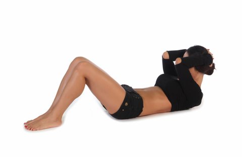 1-바닥에 누워 양쪽 무릎을 세워 두 발을 엉덩이 앞에 놓는다. 두 손은 깍지 끼어 머리 뒤를 잡는다. 숨을 내쉬며 어깨뼈(견갑골)를 바닥에 붙인 채 머리를 들어 가슴 쪽으로 당긴다.