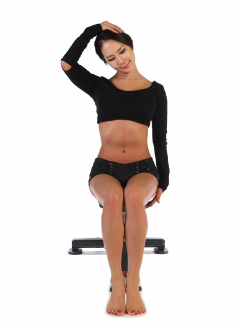 3-의자에 앉아 오른손으로 의자 모서리 부분을 잡아 오른쪽 어깨를 고정 시킨다. 왼팔을 굽혀 머리에 올려 오른쪽 귀를 감싸 잡는다. 그대로 감싸 잡은 채 숨을 내쉬며 왼쪽 팔을 왼쪽 어깨 쪽으로 당긴다.