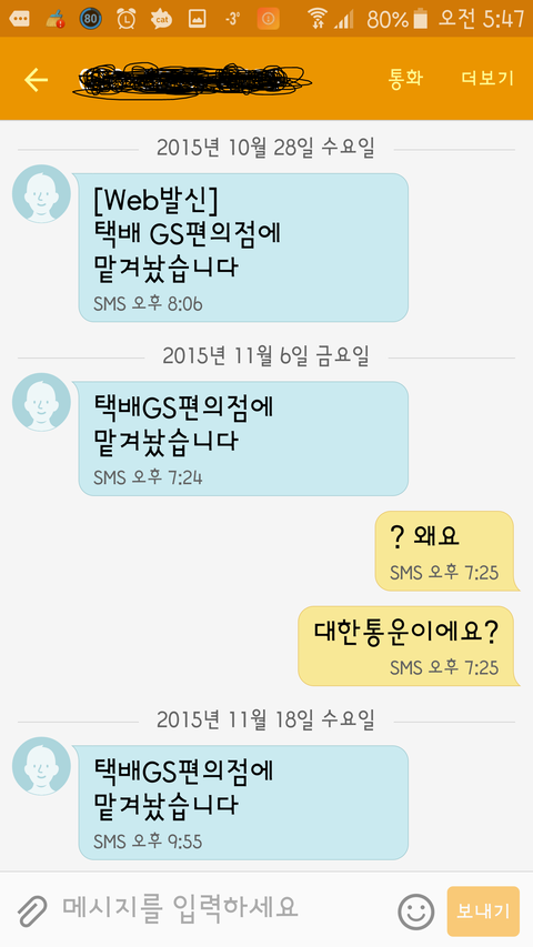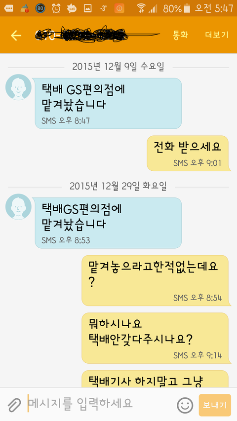 그래서 제가 그때는 택배홈페이지에 불만 글 쓰고 전화까지 할라고했는데