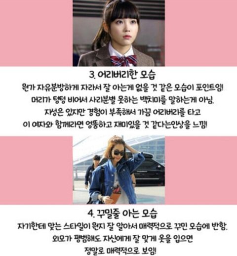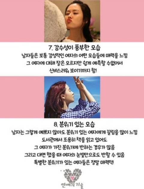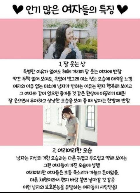 저거 절반이상 해당되도 결국은 얼굴임 못생기고 피부안좋은애가 여리여리하고 어리버리하고 잘웃고 감수성풍부해봤자 남자 안생김 얼굴 예쁘면 겁나 차갑고 무표정하고 그래도 차도녀라고 인기많음 ...는 그래서 내가 남자가 안생기나봄 ㅜ