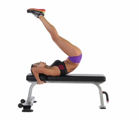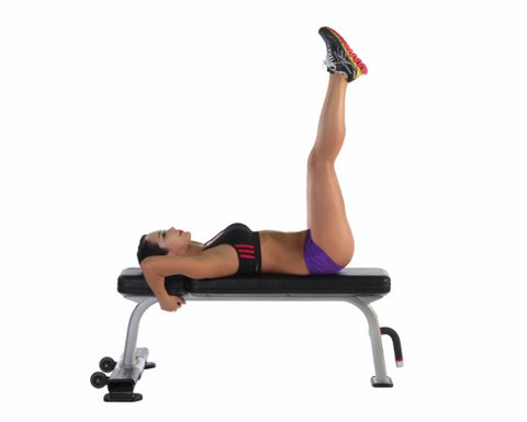 엉덩이가 벤치 맨 끝 부분에 오도록 누워 다리가 허공에 뜨도록 한다. 머리 뒤편 벤치의 양옆 모서리를 양손으로 잡는다. 무릎은 약간 굽히고 두 다리를 붙인다. 숨을 내쉬면서 다리를 수직으로 들어 올린다. 약 1초 동안 정지한 뒤 숨을 들이쉬면서 다리를 원위치로 내린다.