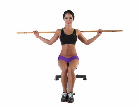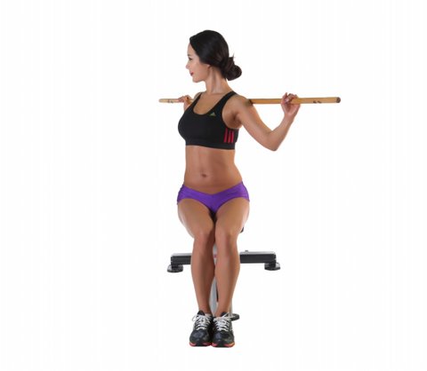 막대나 튜브를 뒷목에 대고 벤치 한쪽 끝에 앉는다. 양손으로 막대 끝 부분을 잡는다. 숨을 내쉬면서 어깨를 천천히 왼쪽으로 비튼다(돌린다). 다시 숨을 들이쉬면서 정면으로 바라본다. 바로 쉬지 않고 오른쪽으로 비튼다. 이렇게 왼쪽 오른쪽을 번갈아 가면서 동일하게 훈련한다.