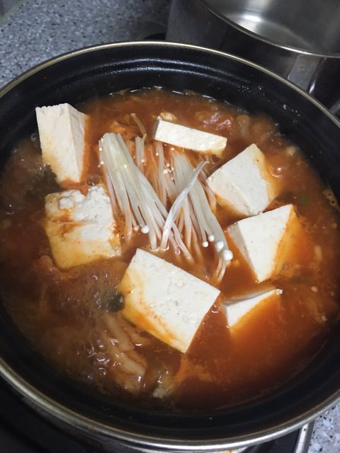 자취생은 다음날 아침까지 먹기위해 국물을 넉넉히 두부는 큼직하게