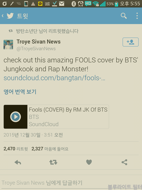 오... 남준이 정국이... 애들이 커버한거 아셨나봐.
