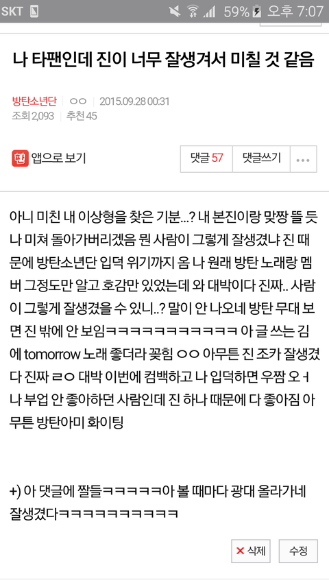 이거 뭐 첫 글이라고 하긴 뭐하지만 나 타팬이었느뎈ㅋㅋㅋㅋㅋㅋㅋㅋㅋㅋㅋㅋㅋㅋㅋㅋㅋㅋㅋㅋㅋㅋㅋㅋㅋㅋㅋㅋㅋㅋㅋㅋㅋㅋㅋㅋ니들 사진이랑 영상 덕분에 가볍게 입덕...했다...아니 나도 이럴 줄으 몰랐어 내가 이렇게 입덕을 하게 될 줄은 뮬랐지 김석진이 잘생긴 탓임 김석진 방탄 입덕하게 해줘서 고머워... 응 너네들도 고마워... 아 근데 난 타 팬일 때 이미 타 팬 톡에서 활발히 활동하던 때라 여기도 스스럼 없었던 것 같음 내가 입덕한지가 어느새.. 2~3개월...? 얘들아 막 나 타 팬이었다고투잡이라고 욕하면 안 돼...♥