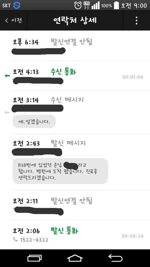 병원도착해서 바로 문자 메시지 송부(2시 43분) 하고,