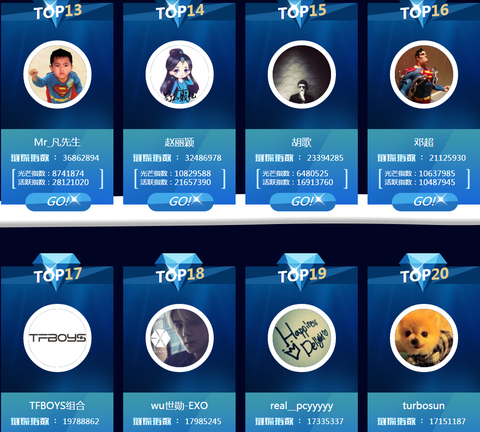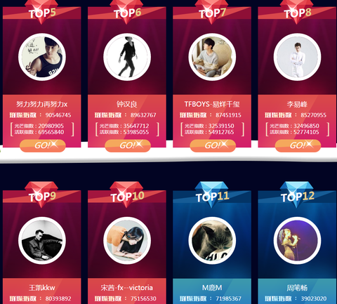 1. TF BOYS 왕원2. TF BOYS 왕준개3. 양양4. 진위정5. 엑소 레이6. 종한량7. TF BOYS 이양천새8. 이역봉9. 왕개10. f(x) 빅토리아