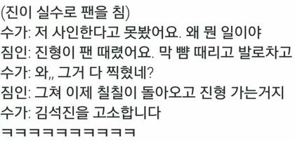 지민이 앞에 미니 배너가 있었는데 김석진이 그걸 쳤는데 팬분이 맞으셨나봄ㅋㅋㅋㅋㅋㅋㅋ 고소당할 사람 여럿 있네 이 그룹... 민슈가 어디 팬싸에서 또 신고한대 또 이러면서 찡찡거리더니ㅋㅋㅋ