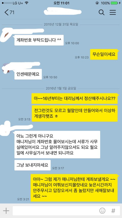 그건 또 아니랍니다. 매니저님께서 물어보셨다며 말을 이으시기에 , 제가 직접 연락드리겠다했습니다. 그렇게 31일 부터 지금까지 계좌불러드리고 기다리고있네요.