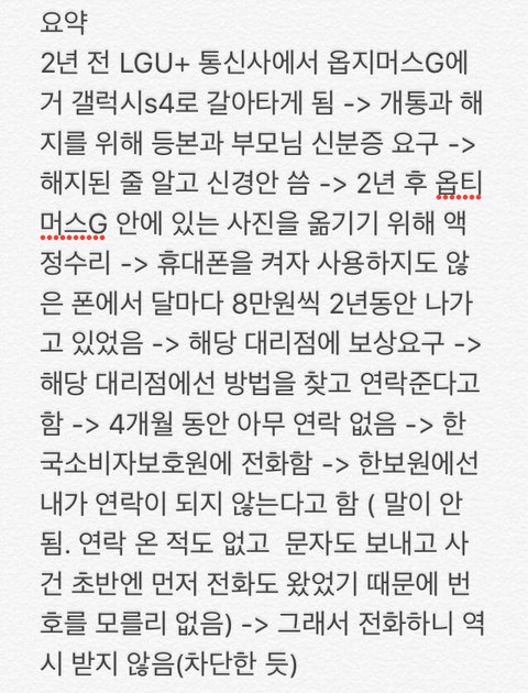 제가 2013년 11월에 동네 LGU+ 직영 대리점(ㅇ*점)에서 옵티머스G(이하 옵쥐)라는 기종에서 갤럭시S4(이하 갤포)로 기기변경을 하였습니다. 이 때 옵쥐 통신사도 LGU+였고 기기변경 후 통신사도 LGU+ 였습니다.