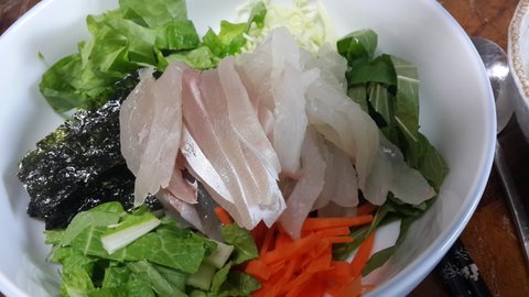 횟거리를 집에서 먹고 남아서 엄마,아빠랑 회비빔밥해서 먹음.