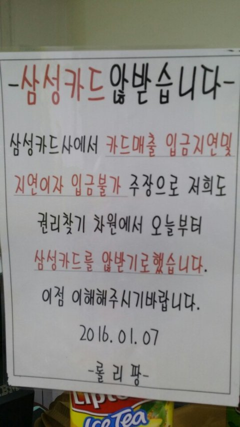 12월11일에 가게를 오픈했고 여러카드사들과도 개맹을 맺었죠. .근데 다른 카드사매출은 입금이되는데 유독 삼성카드매출만 입금이 않되는것을 1월5일에 알게되서 6일아침에 고객센터에 전화해서 자초지종을 얘기하니 자기들도 매출이 일어난걸인지하고있더라고요. . 그런데 자기들 책임이 아니라고 밴사에 알아보래요. . 그래서 저는 삼성카드와 가맹을 맺은많큼 삼성카드쪽에서 책임있게 알아봐달라했습니다. . 그랬더니 좀있다 전화왔더라구요. . 밴사에서 자동이체를 않올려서 자기네는 않보냈다고. . 기가차더군요. . 소비자가 하루만 연체해도 연체이자 물리는 카드사가 자기들이 줄돈은 연락한번 않하고. . . 내가 인지 못했으면 계속이렇게 갔을거란 생각에 원금외에 한달지연이자를 요구하고 답변을 6일까지 요구하고 끊었죠. . 근데 전화가없더라구요. . 그래서 7일인 오늘 아침 전화했더니. . 해당상담사 오늘 휴가래요. .기가차서. . .그래서 다른 상담사한테 제차 요구하고 끊었더니 좀있다 고객센터상담 팀장이 전화하더니 지연이자줄수없데요. . 자기네도 소비자한데 받은돈이 없어서 이익이 없데요. . 순간 전 뻑져서. . 일반적으로 소비자가 카드를 긁으면 카드사는 몇일안에 자기네돈을 가맹점에 주고 소비자한테는 한달후에 받는것입니다. . 그래서 카드수수료가있는것이고 저희한테 원금의3%정도를 가져가고요. . .근데 삼성카드는 한달동안 않줬으면 그만큼 지네들도 이익이 생긴건데 나한테는 못주겠데요. . 그러더니 다음말이 가관입니다. . ."도데체 매출이 얼마나되길레 그럽니까". . . .하. . . 순간 자괴감이들더군요. . 그래서 저는 더이상 얘기하기 싫어서 1시까지 해결책 제시해달라고하고 끊었더니 12시35분에 전화와서 한다는소리가 선심쓰듯 매출대금은 다음주 월요일이후에 넣어주겠다(당연3%제하고 입금하겠죠). . 근데 지연 이자는 못준다입니다. . 햐. . 삼성 브렌드가 참 이것밖에 않되나해서 가게에 삼성카드 않받는다고 푯말 붙였네요. . .사진 첨부했어요. . 조그마한 권리를 찾고싶은 소상공인의 넉두리를 들어주셔서 감사합니다. . .