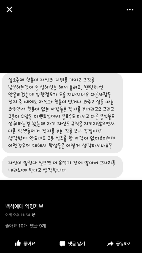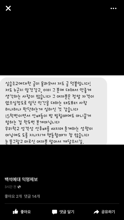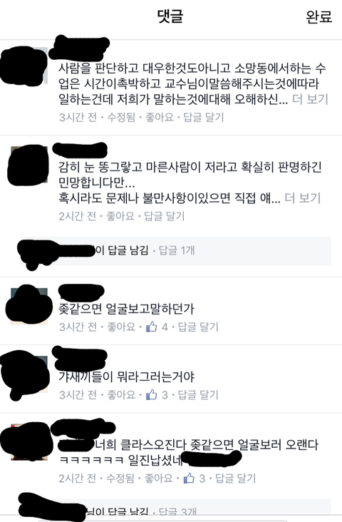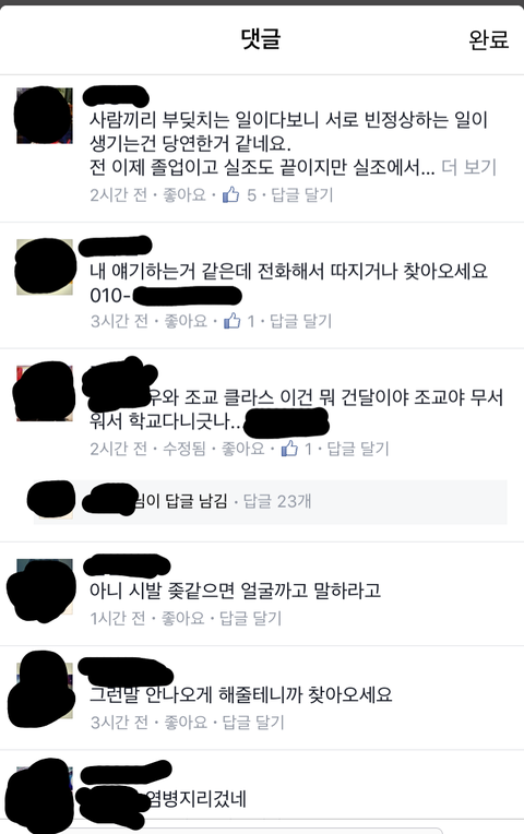 페이스북에 학교 익명제보 사이트가 있는데 거기에 실습조교?를 겨냥한 글과 그 글의 댓글인데 참... 너무 민망할 정도로 중고딩때 일진놀이인지 뭔지 모르겠더군요;;