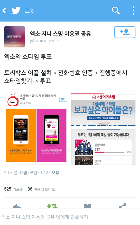 토씨박스 앱 깔아서 주간아이돌이랑 쇼타임 투표ㄱㄱ