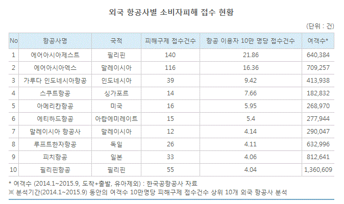 이에 반해 여객수 대비 피해구제 접수 상위 10개 외국 항공사의 경우 에어아시아제스트가 21.86건으로 가장 많았고,