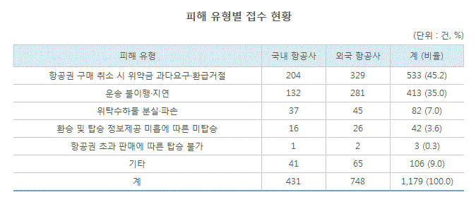 국내외 항공사 관련 피해구제 접수는 총 1,179건으로
