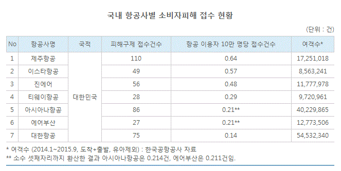 *국내외 항공사 통틀어 외국 항공사인 '에어에시아제스트'가 여객수 대비 소비자피해 접수 가장 많아