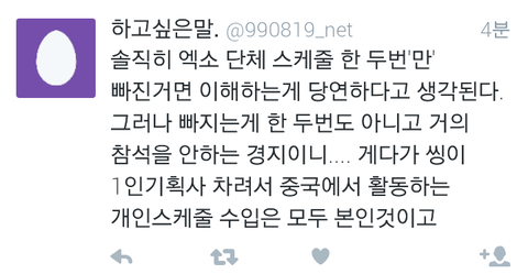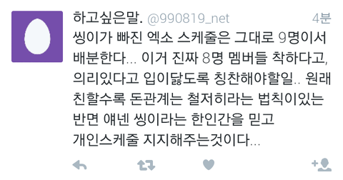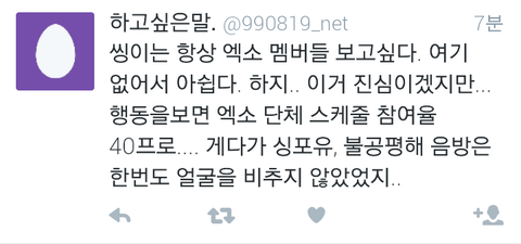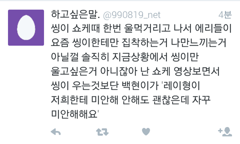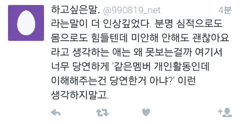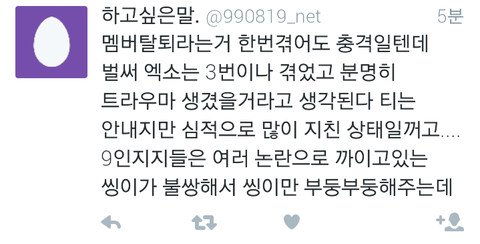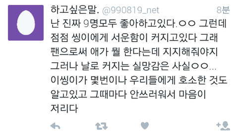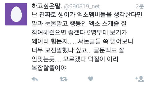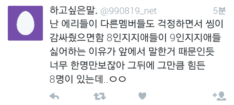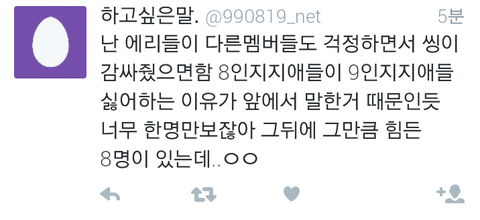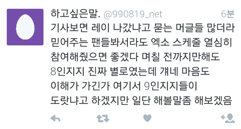 와...진짜 제대로썻다...에리들마음...8인지지의 마음과 9인지지의 마음 둘다 이해하고있는 입장에서 이렇게 말을하니깐 서로의 에리들의마음도 이해가가고 레이가 이제 개인활동만 보지말고 엑소전체활동도 조금만더 신경써주면 그나마 덜싫을텐데 속이훤히 보이니...참