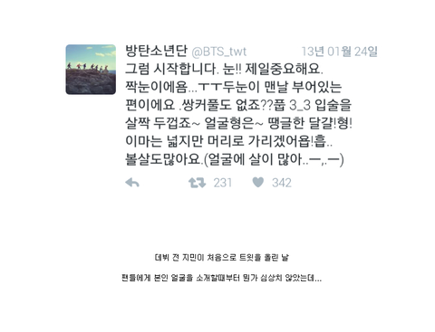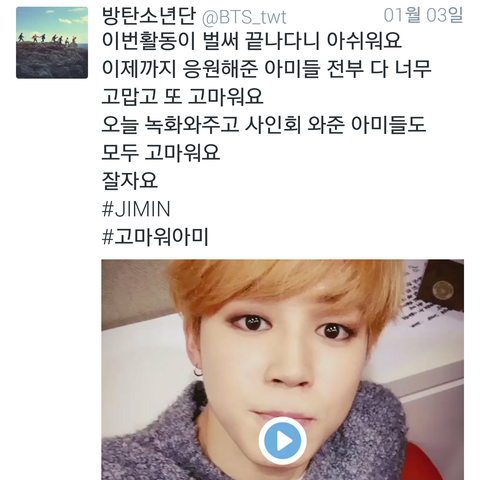 현재의 지민이하고 말투가 너무나도 다른 것 같다. 하지만 난 19살의 지민이 22살의 지민이 둘다 응원하고 사랑한다. 이상 2016년 1월 11일 아미 로그 끝