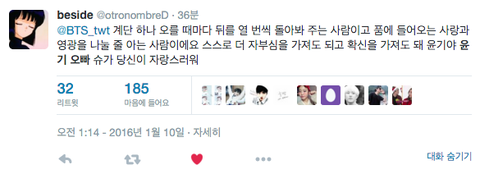 원래 팬하고아이돌하면 엄청 거리감느껴지잖아아이돌좋아하면무조껀싫어하는사람들이 꼭하는말있잖아걔네는 너의존재도모른다..근데 오늘 그트윝읽고 뭔가정말 윤기가말한것처럼 사람대사람으로윤기가나한테와서 자기얘기를해준것같아서그러고나서 처음으로 직멘보내봤는데답은없지만 그걸 윤기가 읽었다는생각만으로도행복하더라..