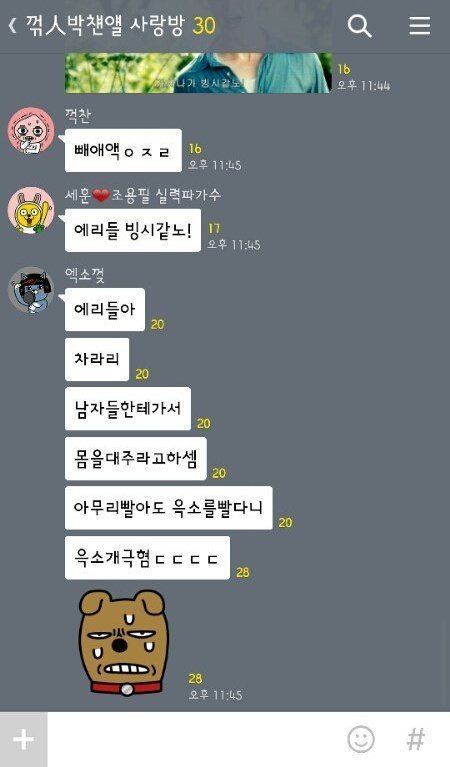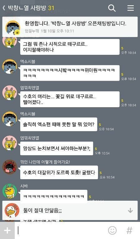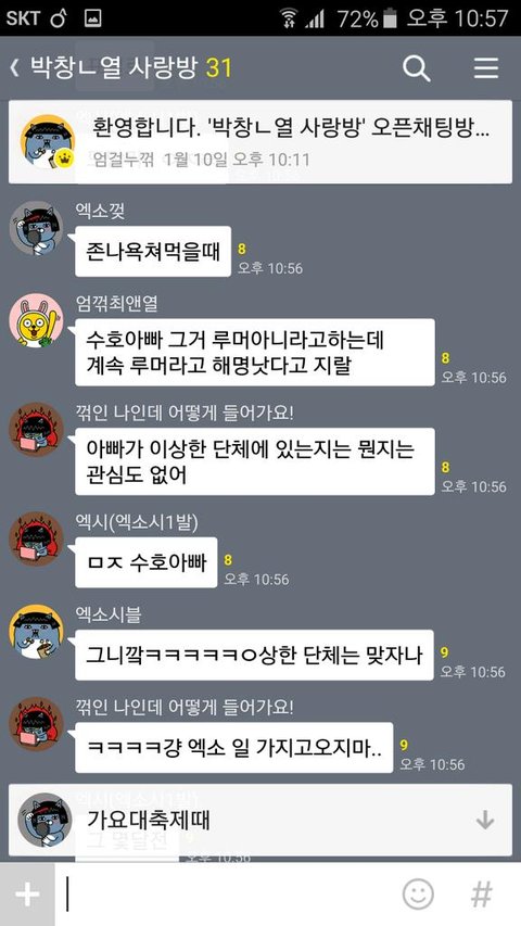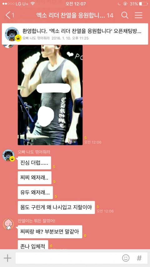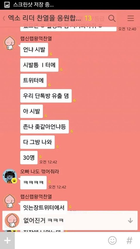 '여성시대'에서는 현재 카카오톡의 오픈채팅 기능을 이용하여 EXO의 가족 모욕, 성적 모욕, 인격 모욕 등 이미 지난 루머들 까지 가져와 EXO를 까내리고 있습니다. 본 사진에서도 알 수 있듯, 여러 사람이 채팅방에 모여 EXO에 대한 험담을 하고 있습니다. 찬열의 신체 부위에 대해 함부로 얘기하고 성적 모욕감을 주는 일은 물론, 타 가수를 언급하며 비교하였습니다. EXO 뿐 아니라 일반인인 EXO-L에게도 EXO의 팬을 하느니 다른 남자에게 몸을 대주는 것이 낫겠다는 등의 성적 조롱을 했고, 이를 아무도 이상하게 생각하지 않습니다.