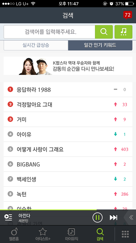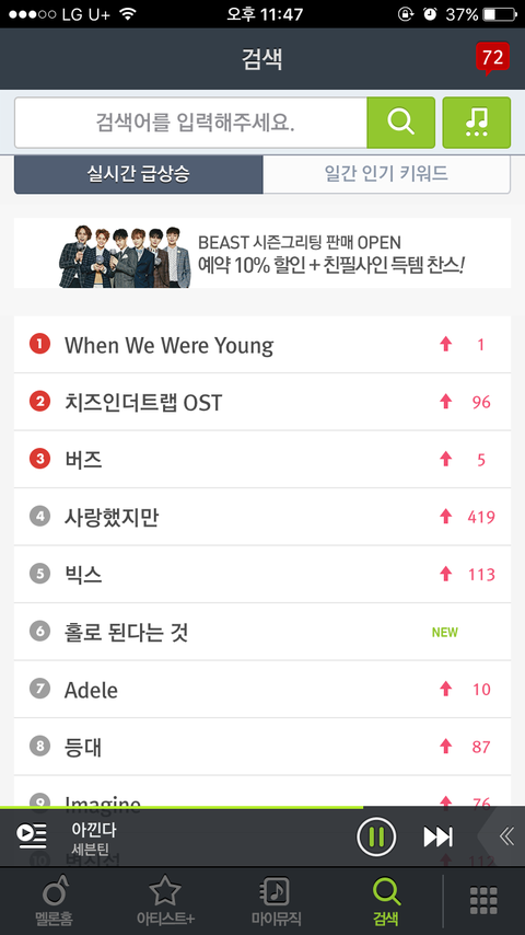 승관이가 노래 추천해줘서 실시간 급상승에도 오르고 일간 인기 키워드에도 올랐잖아 이렇게 스밍도 잘하자ㅠㅠㅠ