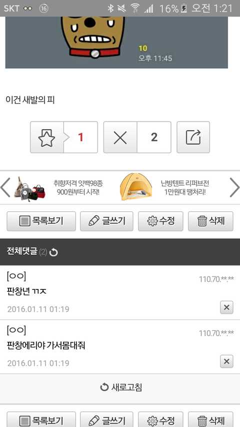 우리 여ㅅ1대란때 갤가서 알리니까 판창1련이라고 니가 몸대주라 그랬음
