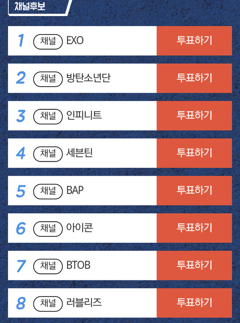 이거 투표하면 네이트에서 엑소 이름으로 쌀 1400kg을 기부한대! 우리 애들한테 좋은거고 하르에 5번씩 가능하니까 꼭 하자!!ㅎㅎ... 지금 1위랑 1300표쯤 차이나 원래 더 많이 차이났는데 단시간에 좁아졌어! 얘들아 많이 하자!!