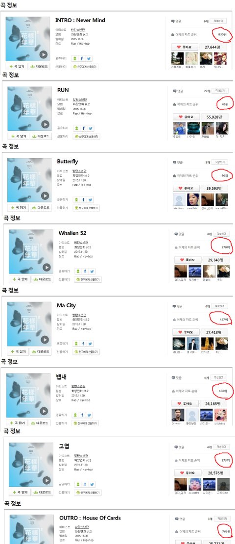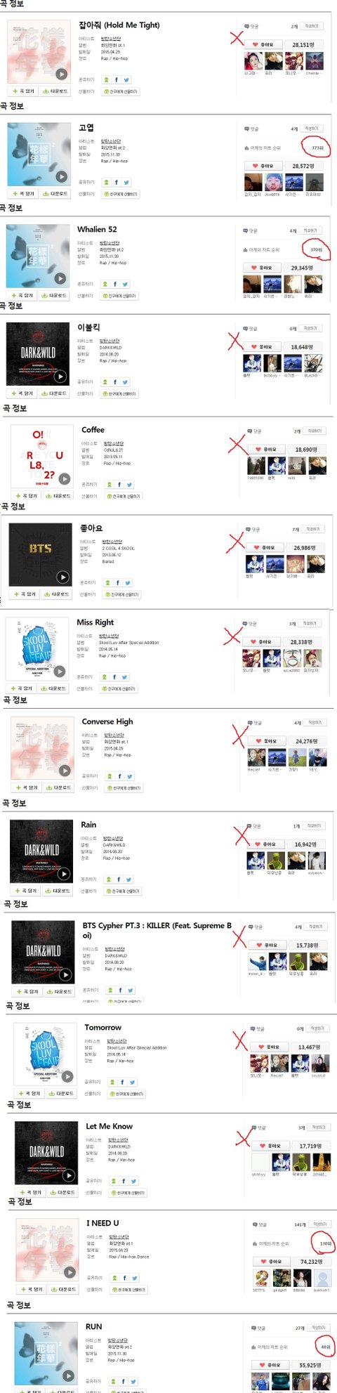 1) 수록곡 리스트 어제의 순위 (1000위 밖으로 밀려난 곡은 정보가 없는듯?-x로 표시)