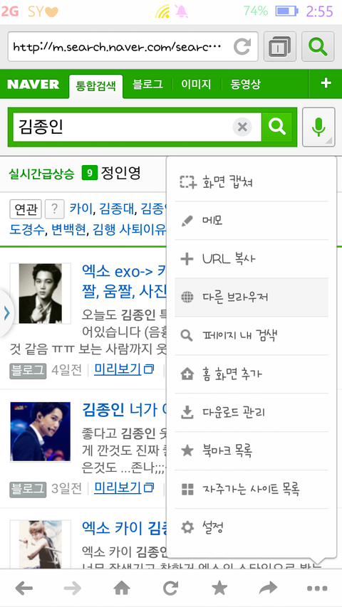 저처럼 주소창이 회색이신 분들은 오른쪽 하단에 ... 누르시고 다른브라우저 누르시면 주소창 파란색으로 변경