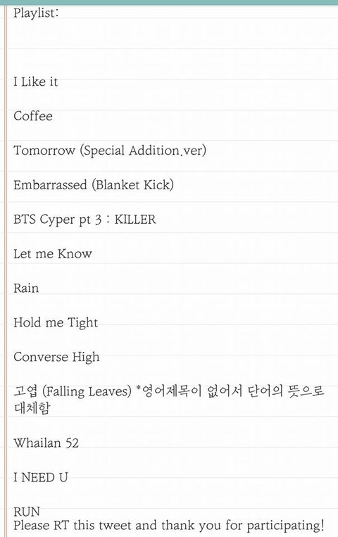 Hello International fans! We are the Korean ARMY fandom. Since BTS is finished with their RUN promotion, we have planned an event to stream songs that are not as popular as their title songs. The list below shows the songs we are going to stream. The playlist is comprised of 12 non-title songs that we voted on. We also included RUN and I NEED U because the upcoming music awards look at the rank of title songs. Please check the playlists below and participate if you can. Please bear in mind that Tomorrow is the special edition version. You must ONLY stream these songs, as it cannot go over 1 hour.