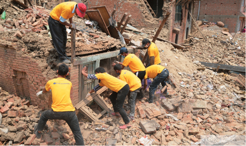 2015년 4월 대지진 피해를 입은 네팔에서 현지의 위러브유 회원들이 무너진 건물들의 잔해를 치우며 복구작업에 구슬땀을 흘리고 있다.