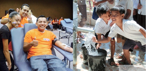 미국 오클라호마시티의 위러브유 회원이 헌혈에 참여하며 뿌듯한 미소를 짓고 있다.(왼쪽) 캄보디아 타케오 주 속안폿소르 초등학교 물 펌프 지원.(오른쪽)