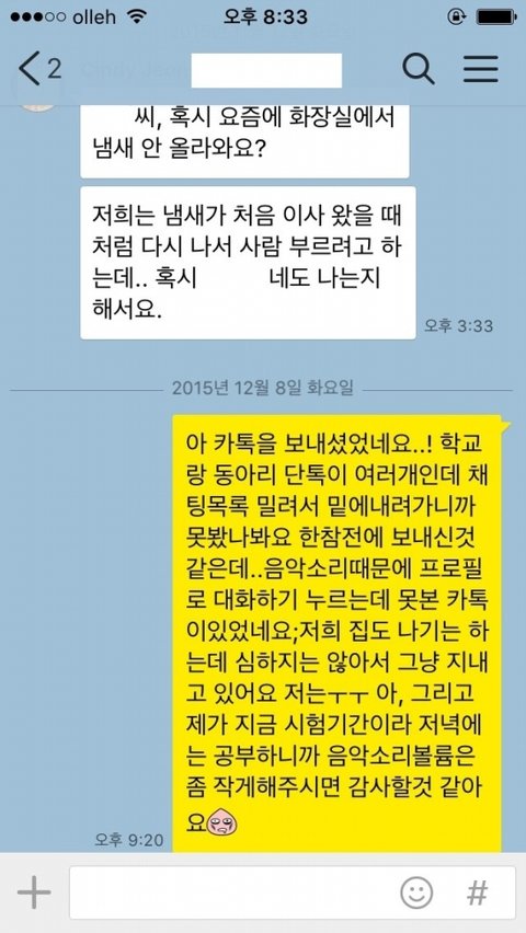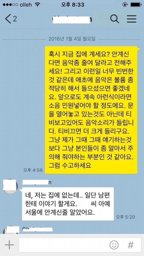 집 여자분께 남편분 또 음악크게 들으니 소리 줄여달라고 카톡을 보냈습니다. (저희집이 대문에서
