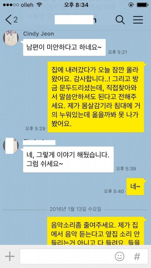 있어서 결국 옆집 여자분에게 정중하게 볼륨을 좀 줄여달라고 카톡을 보냈었어요.( 전에 두집 다