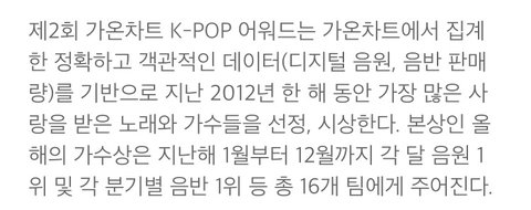 음원 성적 반영되는 기간은 2012년 1월 부터 12월까지인데 이글 올라온건 2013년 이니까 올해에도 작년 음원성적만 들어간다는 얘기 아님? 고로 지금 하는 스밍은 가온에 반영되지 않는단 소리지... 혹시 틀린거 있음 말해줘 빛삭할게...ㅎㅎ...